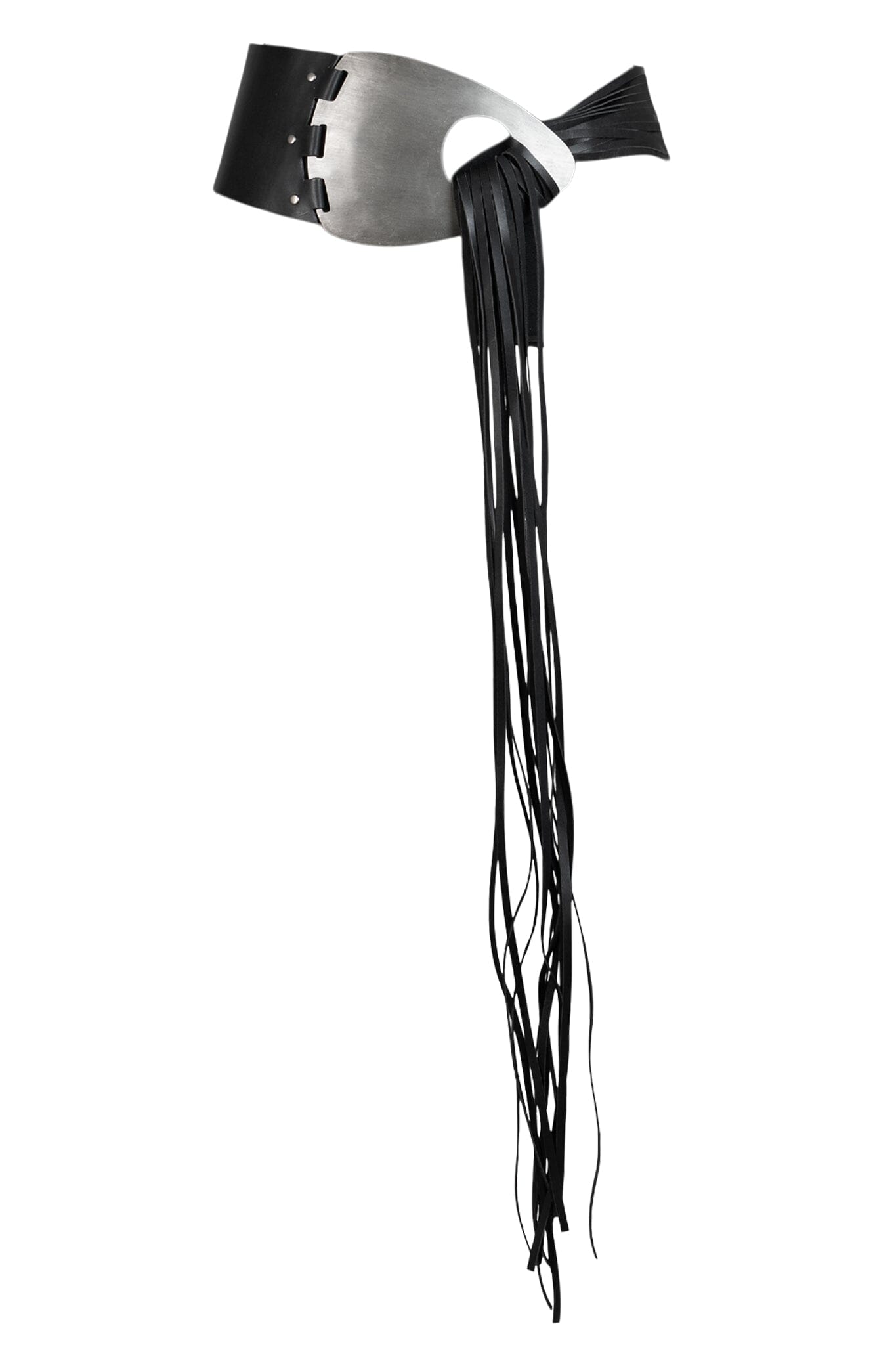 Adjustable fringe leather belt with large metal ornament